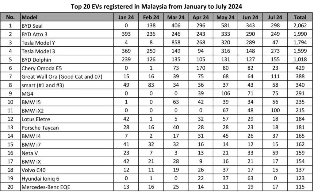 Jenama yang paling banyak adalah daripada BYD yang mencatatkan penjualan 298 buah kenderaan untuk model BYD Seal. Data ini amat mengejutkan kerana harga untuk kenderaan ini bukan pada harga yang mampu milik RM179,000.